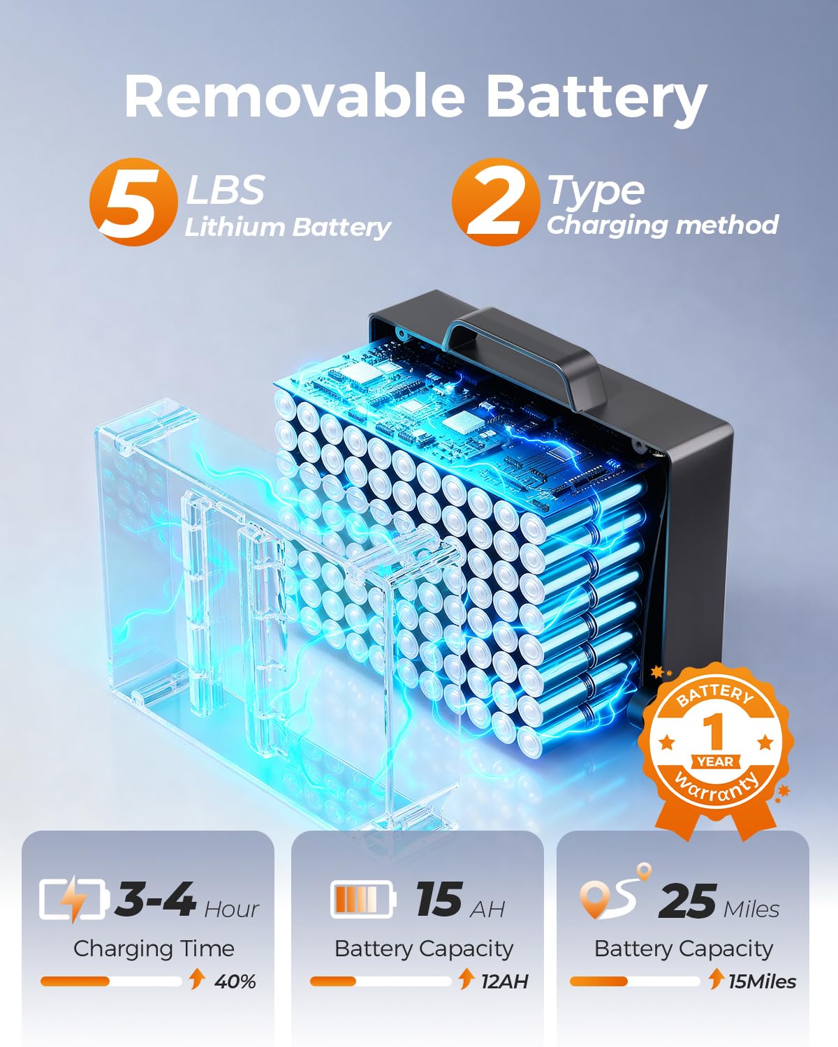Includes a detachable 15Ah lithium battery with an estimated range of up to 25 miles per charge, depending on terrain, user weight, and operating conditions.